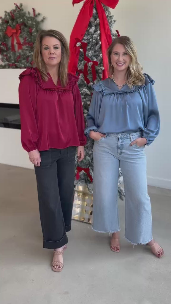 This Satin Ruffle Blouse combines lightweight luxe satin with delicate ruffle details for a flowy, effortless look. Its soft drape enhances comfort and style, making it perfect for an easy and elegant outfit for the holiday season!