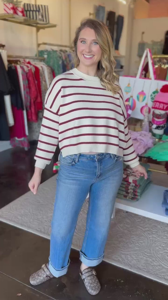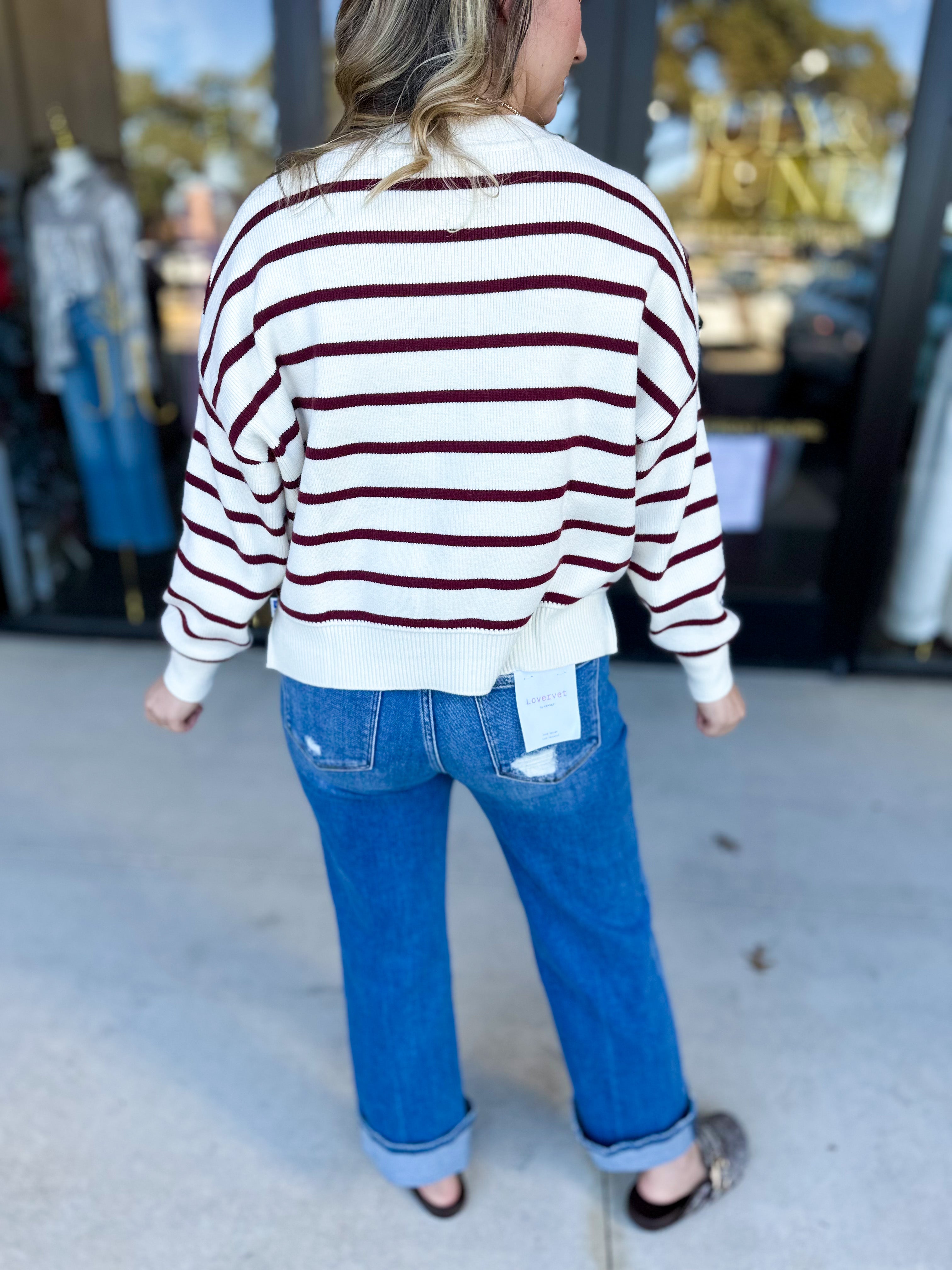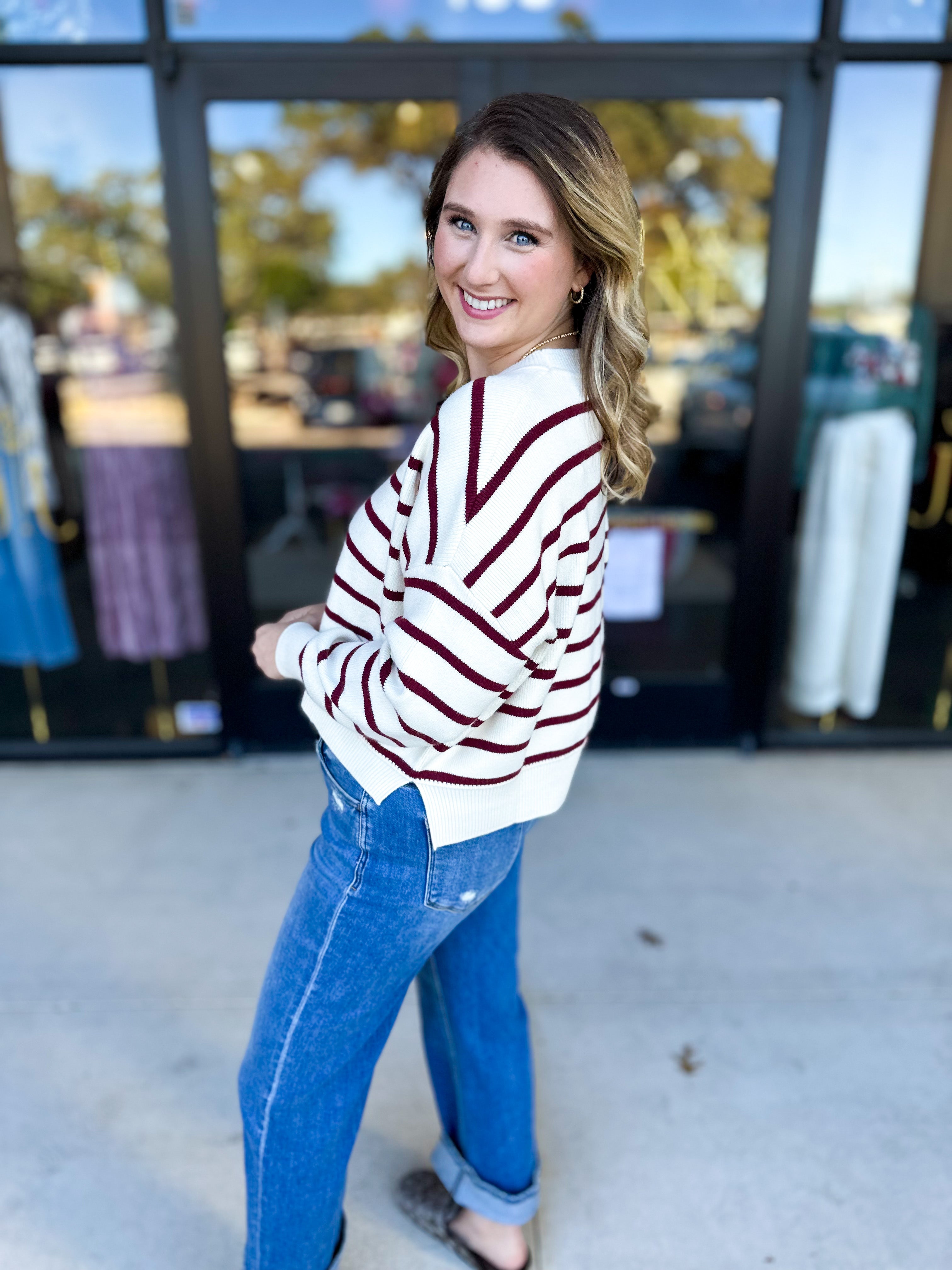 Embrace cozy warmth with the Ivory & Burgundy Sweater Top. Its soft fabric and easy fit makes it ideal for comfort while still looking cute! A winter casual must have that you can easily wear for everyday looks!
