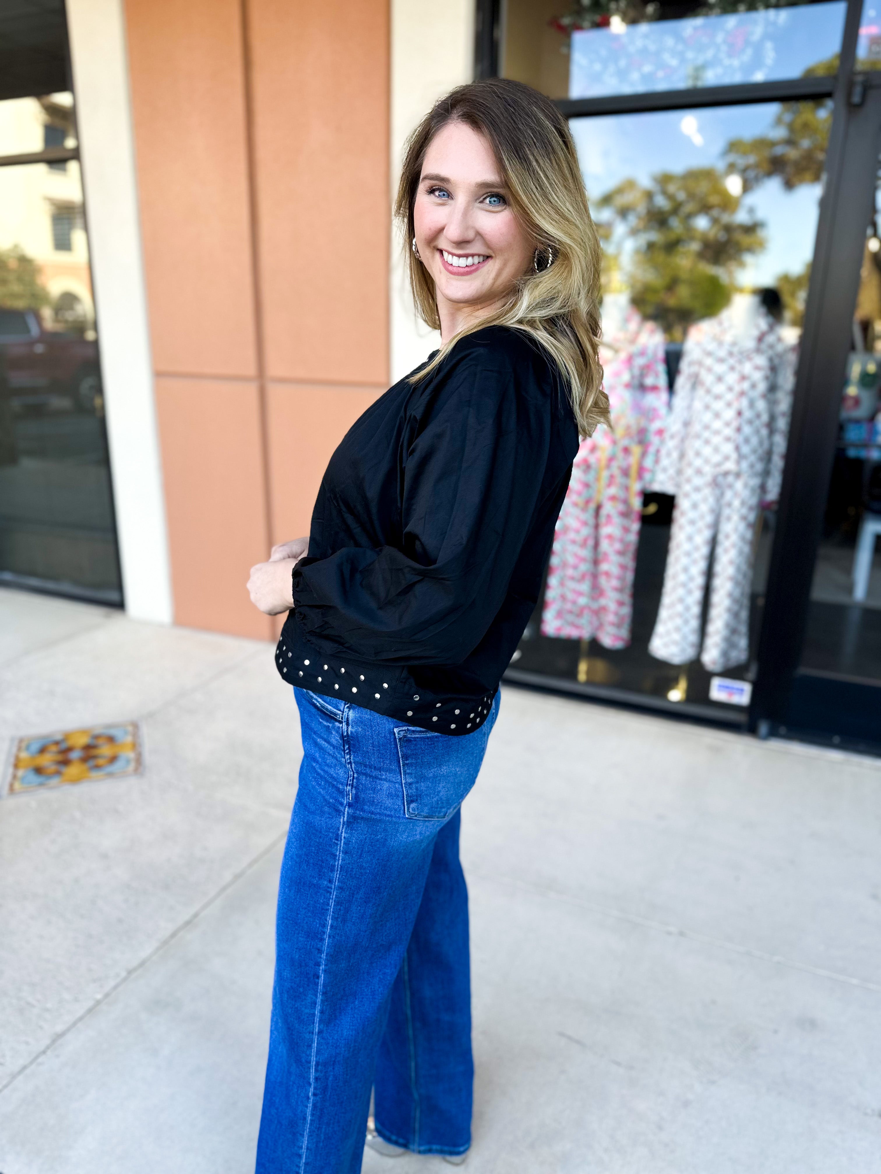 The Studded Black Blouse brings just the right amount of edge with the silver studs along the neckline and hem. Its polished fit makes it a breeze to throw on, with any jeans and look effortlessly chic. A little edgy, a little flirty—totally wearable!