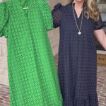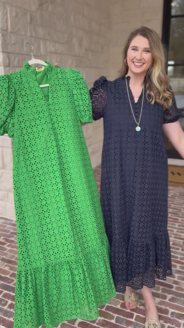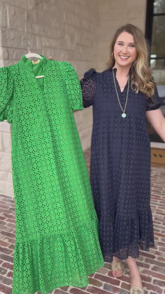 Embrace effortless style with our Graceful Gathering Midi Dress in Green and Navy. Its crochet fabric and effortless fit make it perfect to simply throw on and feel put together. This dress offers a feminine style ideal for any occasion!