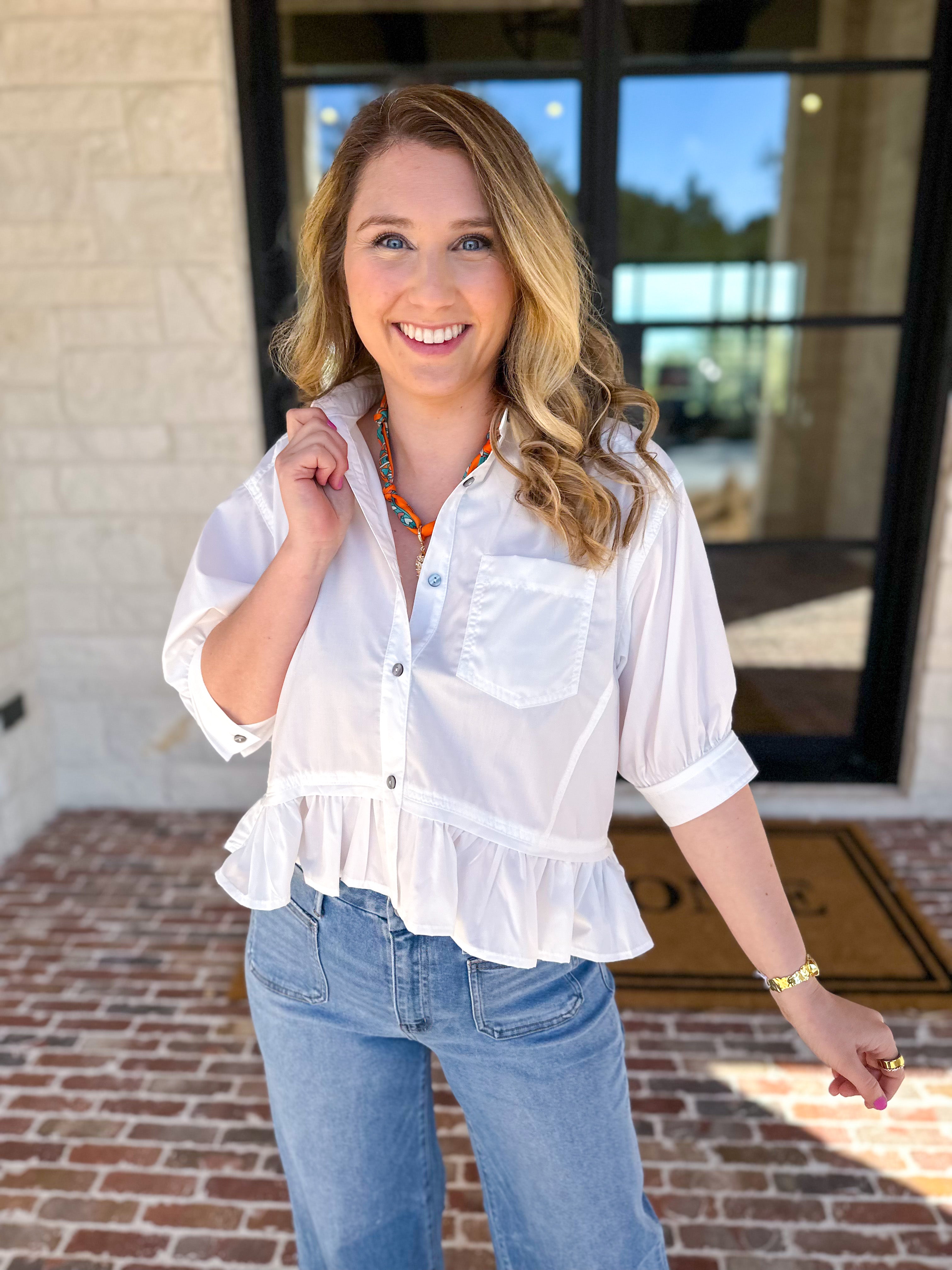 Soft, playful, and effortlessly flattering, the Move with Grace Top is a feel-good favorite made for everyday wear. Designed with a crisp button-front and a flirty ruffled hem, this top brings just the right touch of charm to a classic silhouette. Lightweight and easy to style, it’s the kind of piece that moves seamlessly from casual days to dressed-up moments.