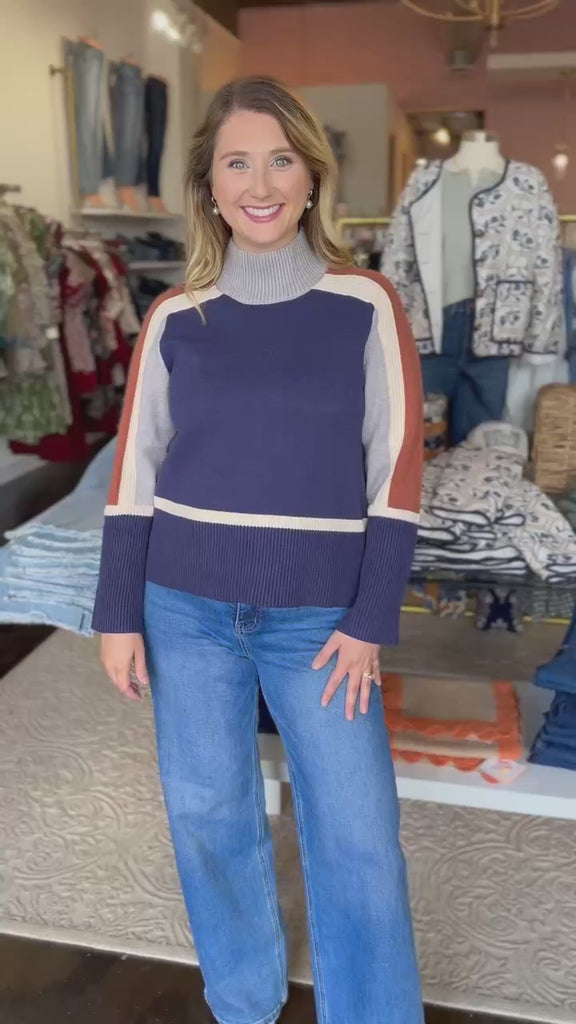 Embrace cozy warmth with the THML Navy & Rust Sweater in classic fall colors. Its soft fabric makes it ideal for effortless layering, adding a stylish yet comfortable touch to your seasonal wardrobe. Perfect for crisp days and relaxed outings!