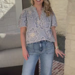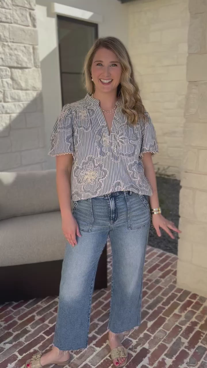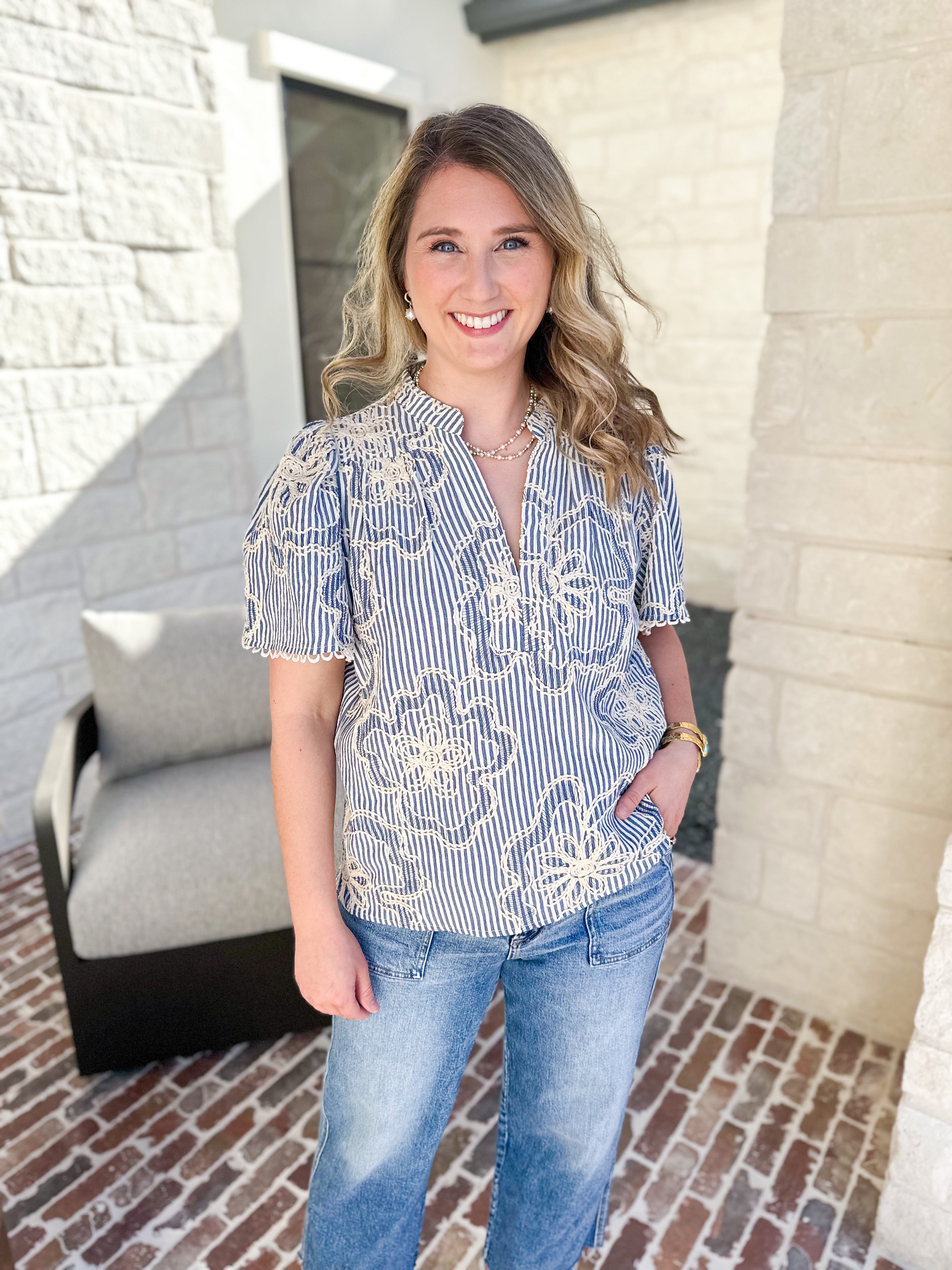 The Blue Skies Embroidered Blouse features delicate embroidery and small stripes that adds a refined, feminine touch. This blouse offers effortless style that transitions seamlessly from Winter to Spring! We love a simple top that can be styled in your own way!